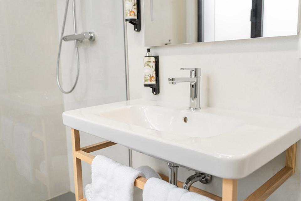 Amplia habitación de 25m² con baño privado con ducha. La estancia tiene dos posibilidades: cama extragrande o dos camas individuales. Ideal para dos personas, aunque con opción de solicitar cama supletoria bajo petición.